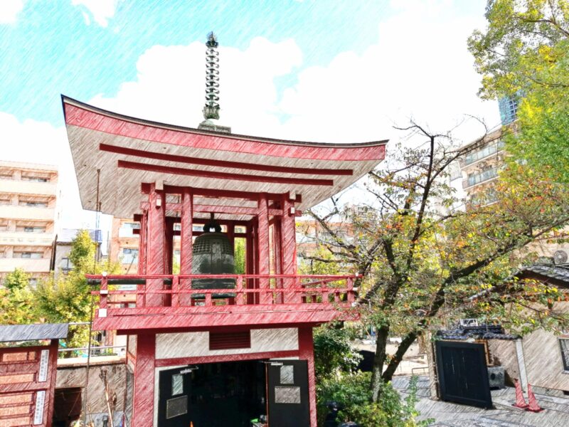 今日の帰路に着くとき写した灯籠と鐘楼堂。大阪市北区摂津国分寺にて、2022年11月5日に撮影。